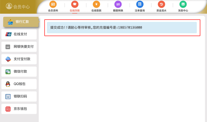 登陆澳门赌场会员后,在会员信息区域,点击“在线存款”