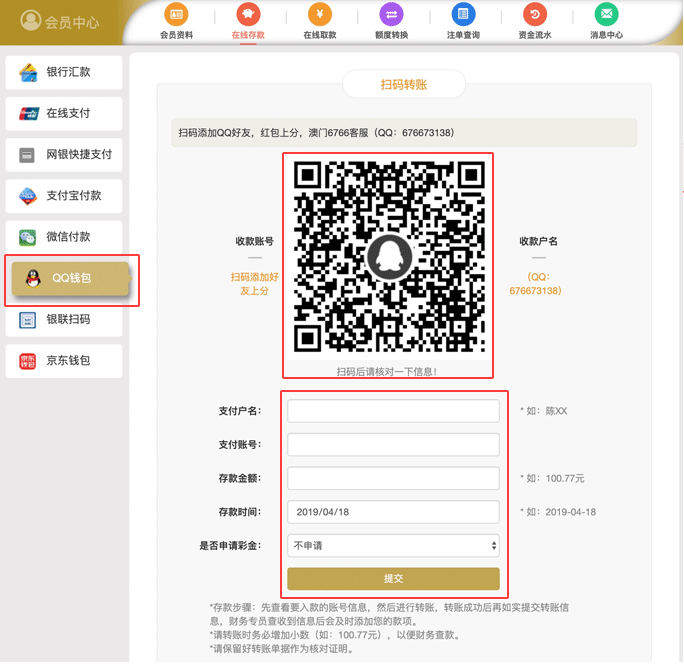 我们提供多种入款方式,点击“QQ钱包”,扫描二维码,并输入相关信息后提交