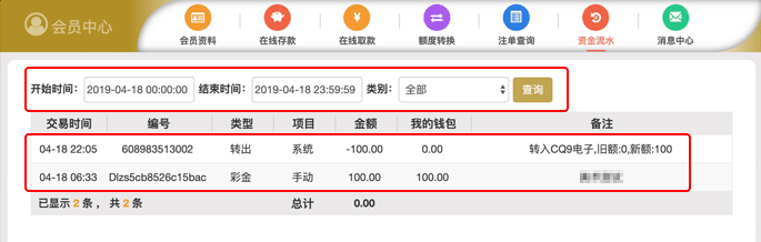 登录澳门赌场后后,在网站右上角点击“资金流水”