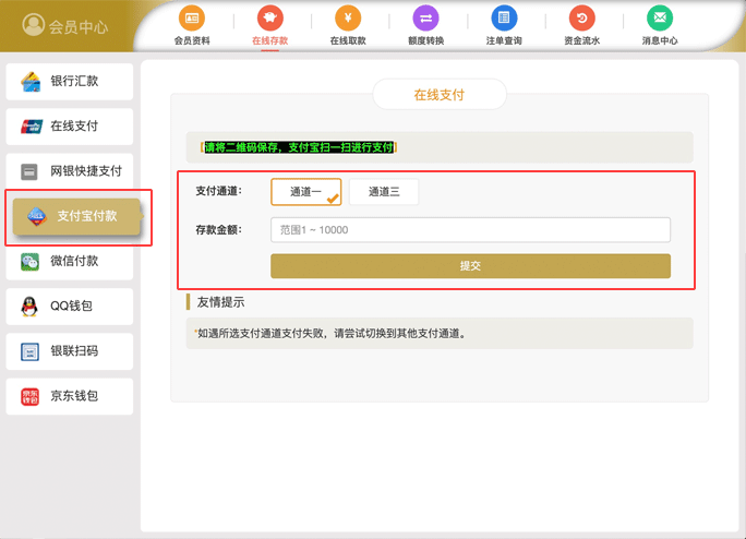 我们提供多种入款方式,点击选择“支付宝付款”,同时选择入款通道并输入金额后提交