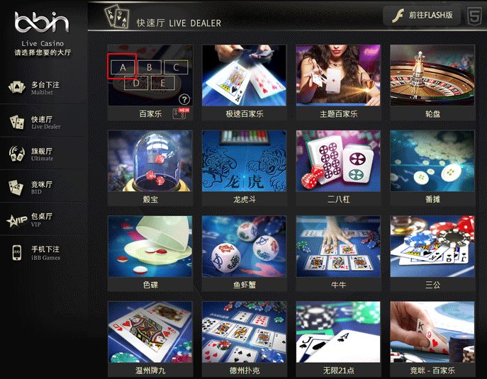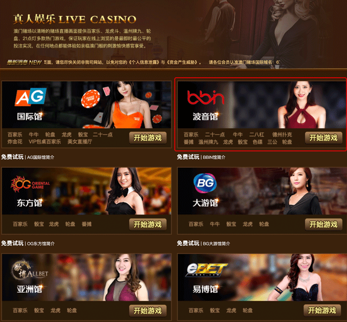 我们提供十大真人视讯,分别是BBIN、AG、MG、GPI、PT、AB、EVO、BG、GD、申博。这里 我们以BBIN波音厅为例进行说明